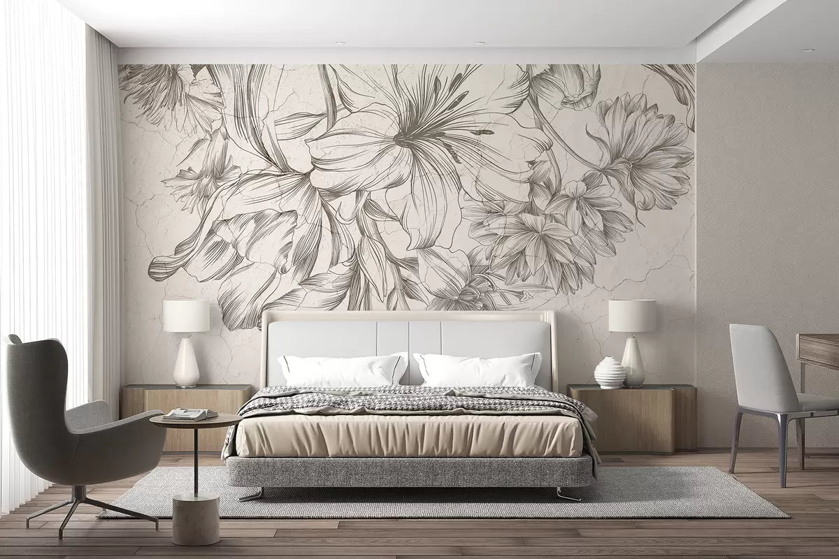 Papier peint Un croquis en noir et blanc d'un imprimé graphique de grandes fleurs N° w01253