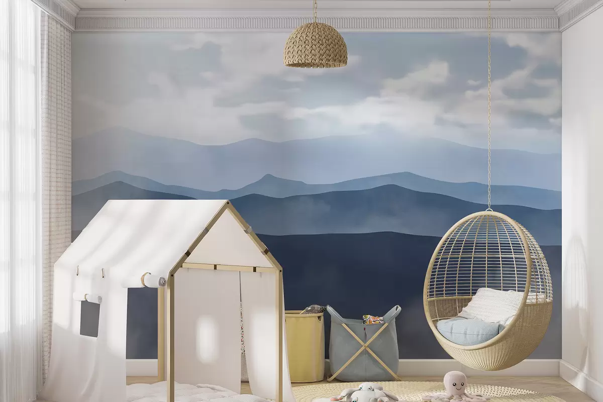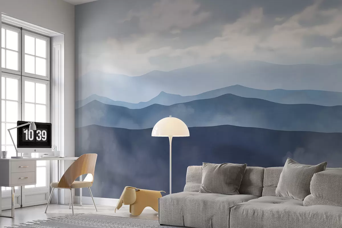 Papier peint Paysage de montagne minimaliste brumeux avec collines et ciel nuageux N° w01317