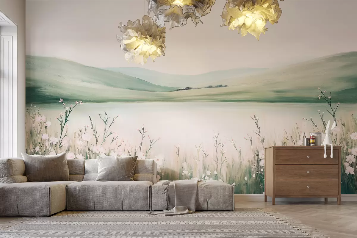 Papier peint Prairie fleurie, paysage naturel, lac, fleurs roses, collines verdoyantes N° w01387