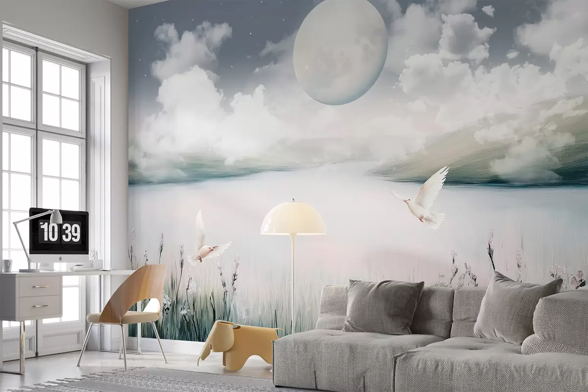 Papier peint Beau paysage avec lac, prairie fleurie, lune sur le ciel étoilé de la nuit, oiseaux volants, nuages N° w01389