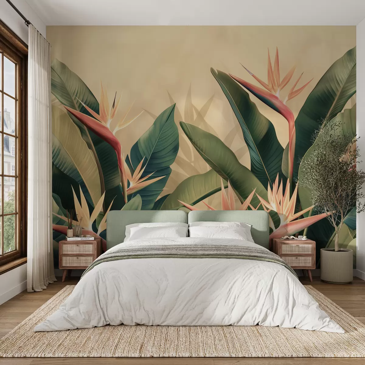 Papier peint Arrangement luxuriant de fleurs tropicales entouré de grandes feuilles vert foncé N° w01484v1