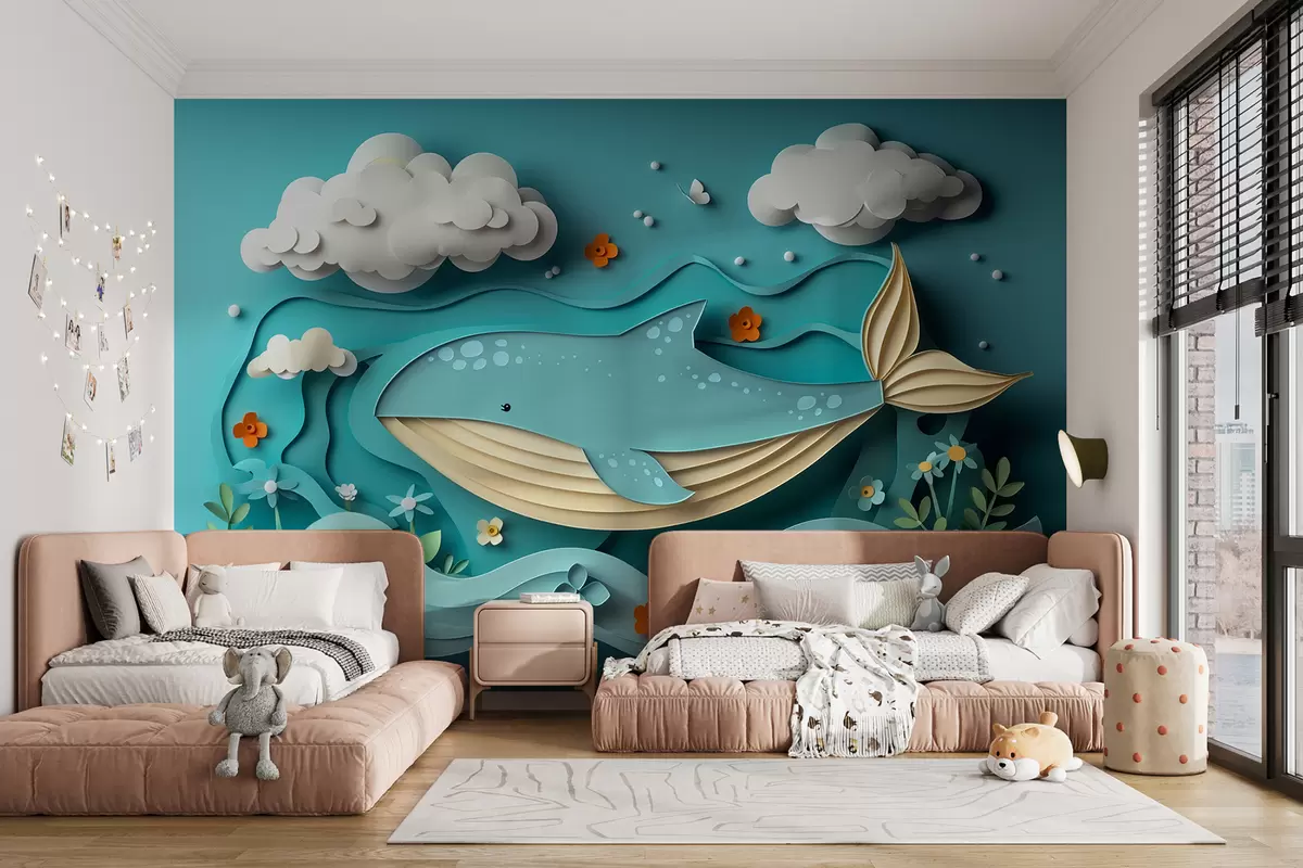 Papier peint Baleine ludique dans les nuages en papier découpé, effet 3D N° w01496