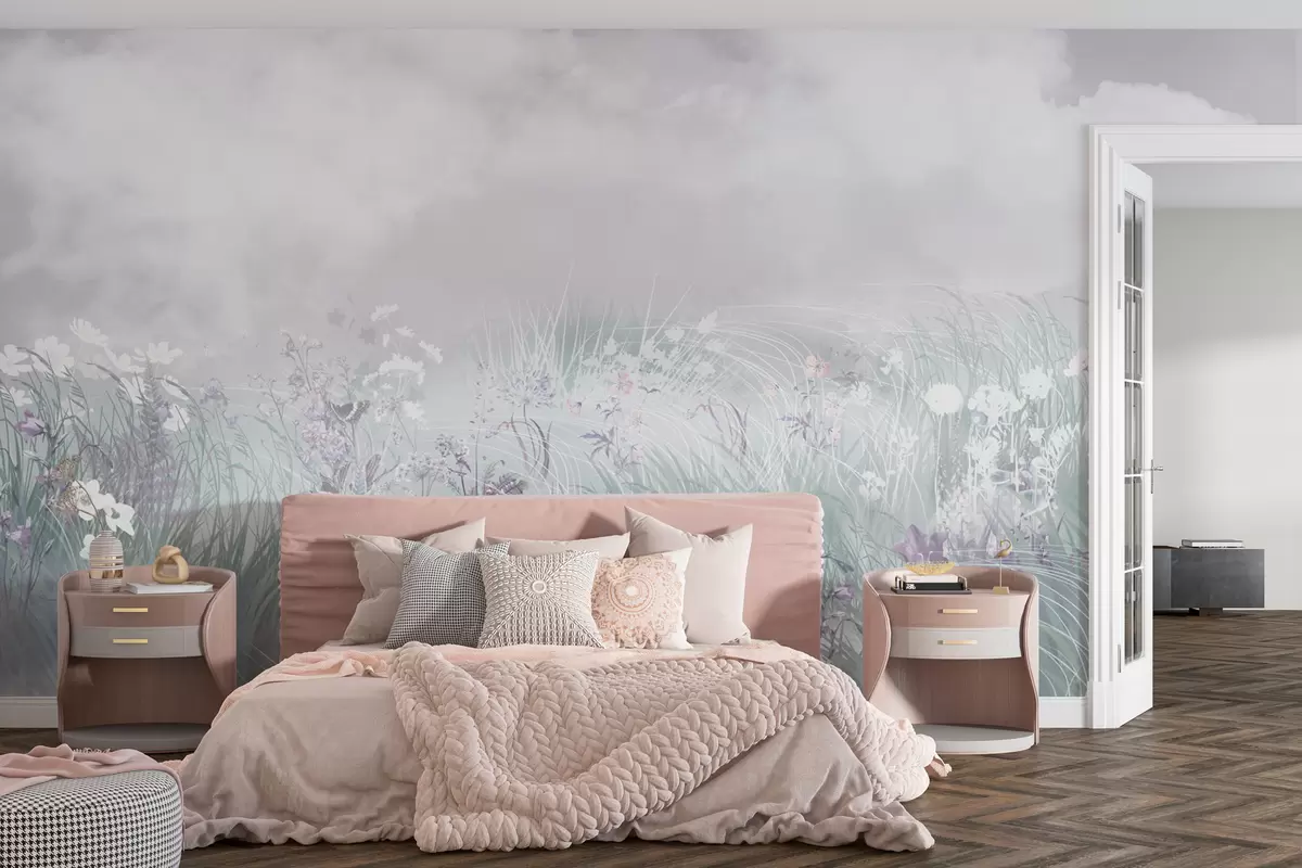 Papier peint Fleurs sauvages et herbes avec ciel et nuages rosés N° w01624v1