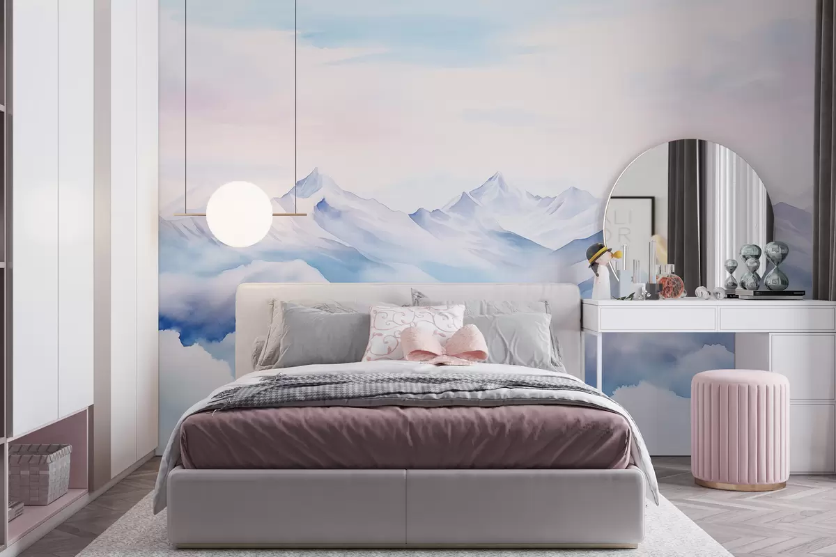 Papier peint Paysage de montagnes, aquarelle, couleurs violettes douces N° w01787