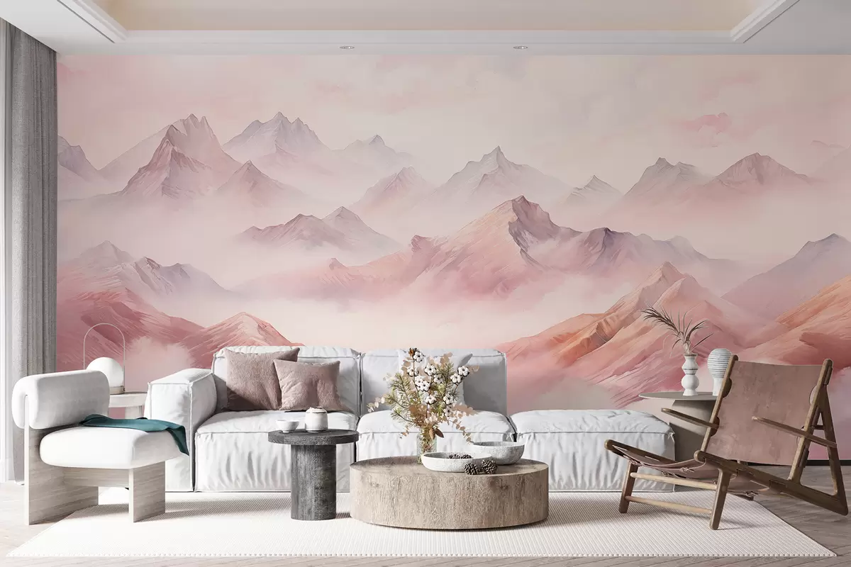 Papier peint Montagnes avec nuages, aquarelle, couleurs douces beige et rose N° w01790