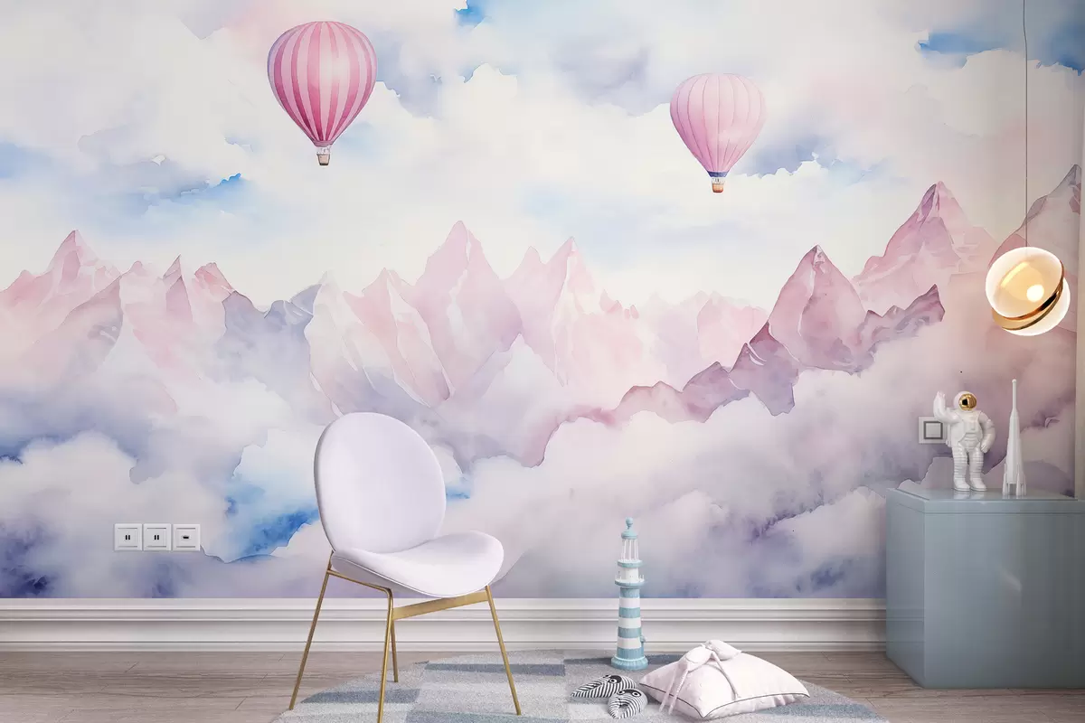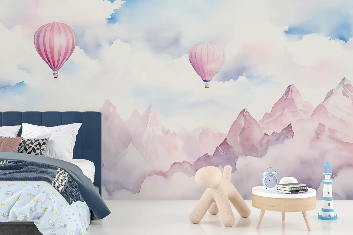 Papier peint Paysage de montagne avec ballons d'air, aquarelle N° w01792