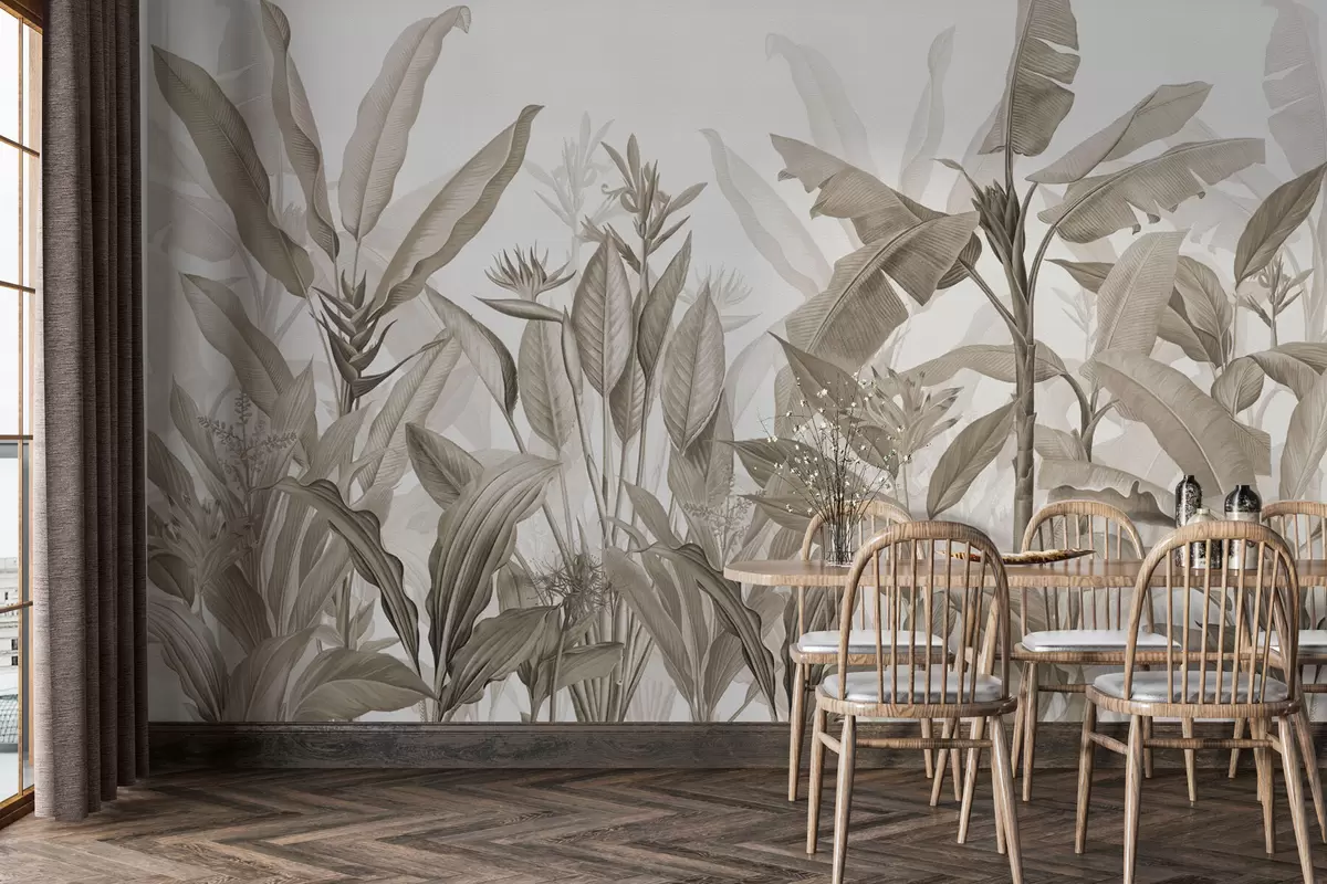 Papier peint Feuilles et fleurs tropicales sur un fond clair en style sépia N° w01834v4