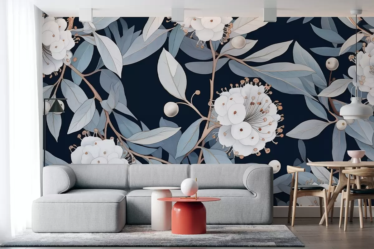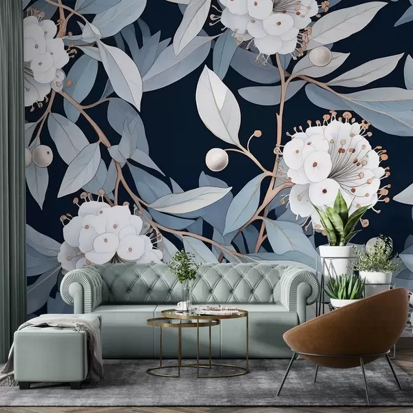 Papier peint Ornement de fleurs vintage, abstraction, baies, couleurs bleues N° w01881