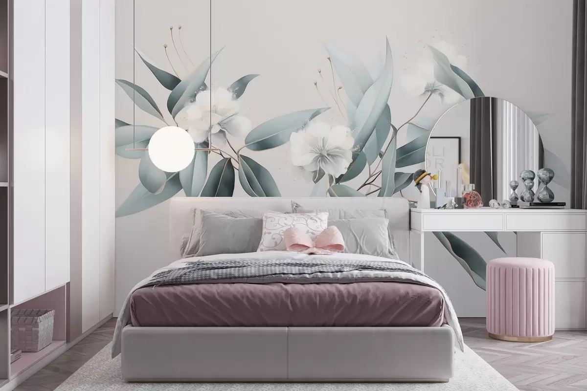 Papier peint Fleurs de coton, nature, dessin acrylique, couleurs grises douces N° w01884