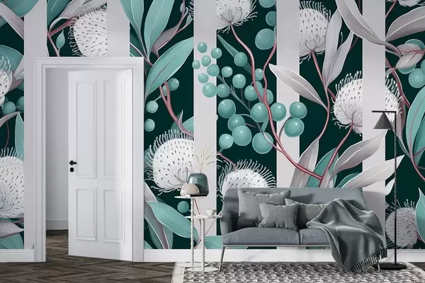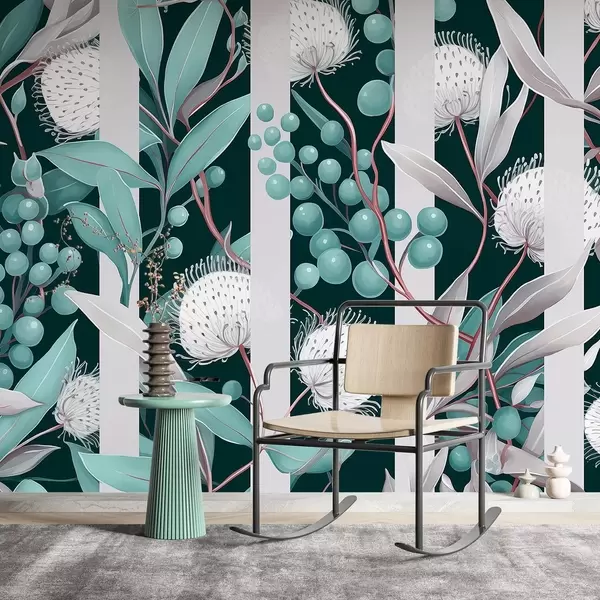 Papier peint Ornement de fleurs avec baies sauvages, vintage, couleurs grises et vertes N° w01886v2