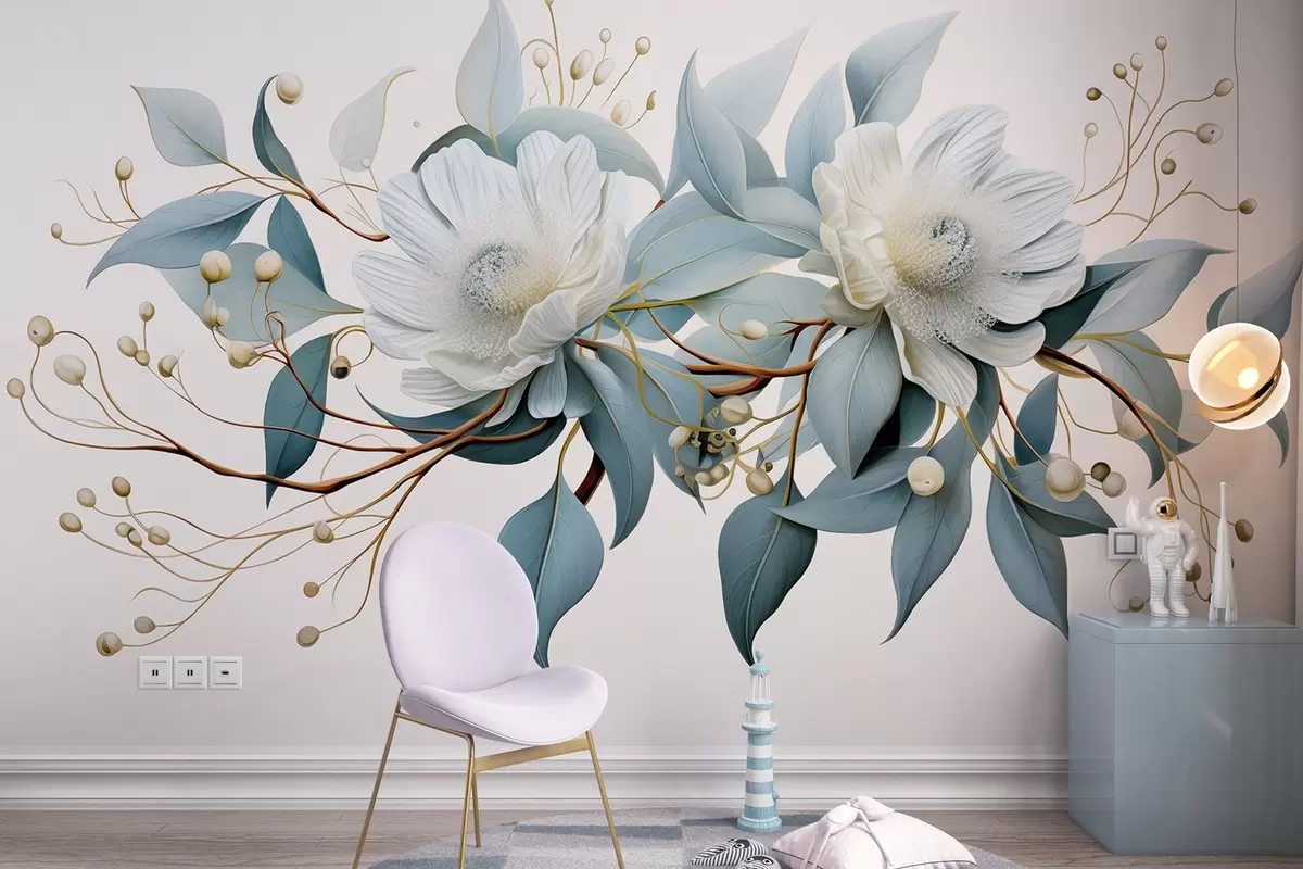 Papier peint Magnifiques fleurs acryliques avec feuilles et baies, réalisme N° w01887