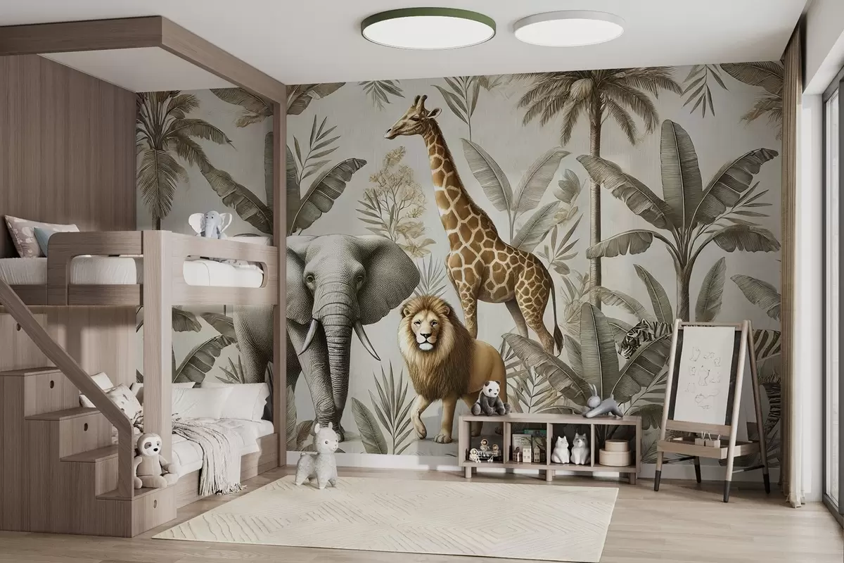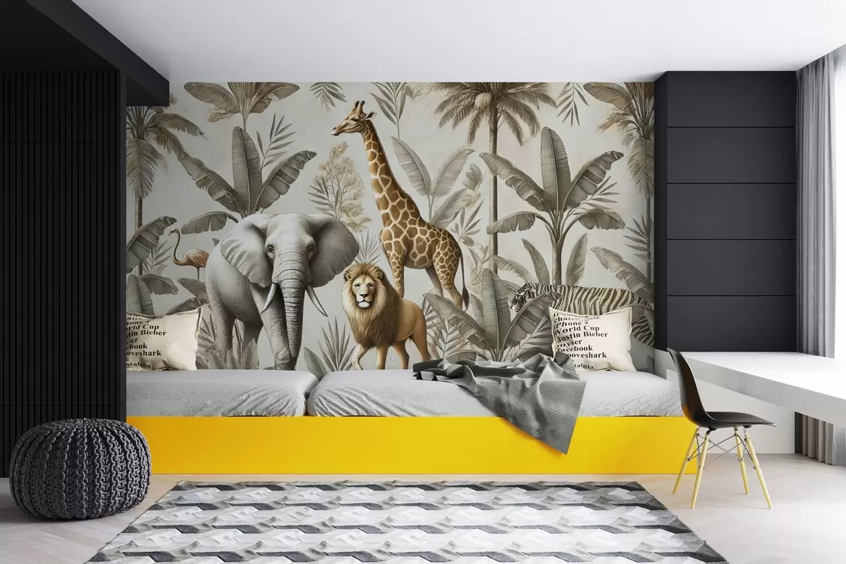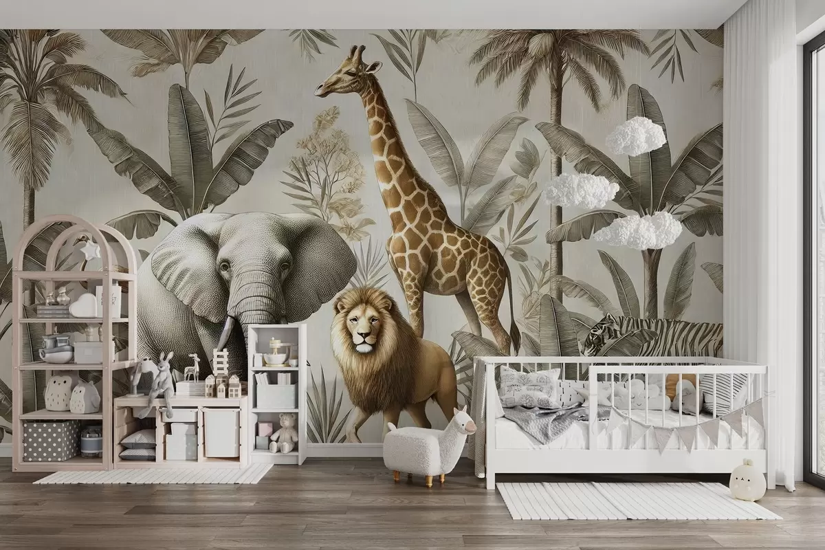 Papier peint Papier peint Safari pour enfants avec des paysages tropicaux et divers animaux dans des couleurs élégantes N° w01956