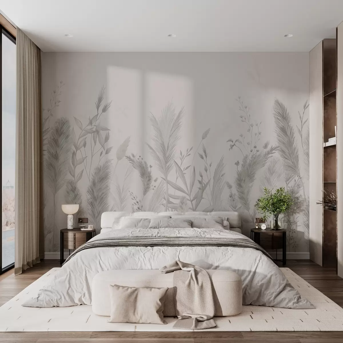 Papier peint Grandes herbes et fleurs des champs dans des couleurs neutres N° w02004