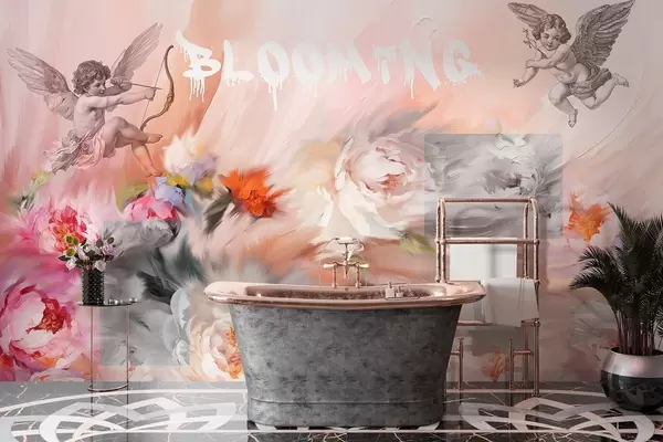 Papier peint Fleurs épanouies, pivoines, petits Cupidons avec des flèches, art acrylique N° w02023