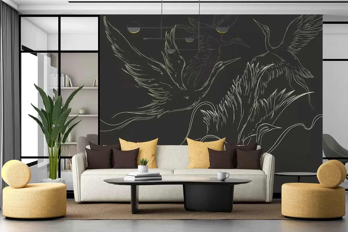 Papier peint Oiseaux en vol, minimalisme, dessin au trait, nature, fond sombre N° w02061v3