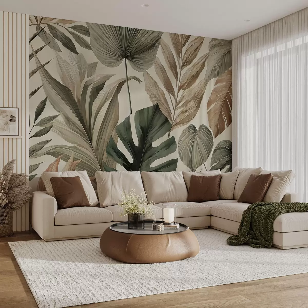 Papier peint Grandes feuilles tropicales dans des tons pastel délicats et sobres N° w02082