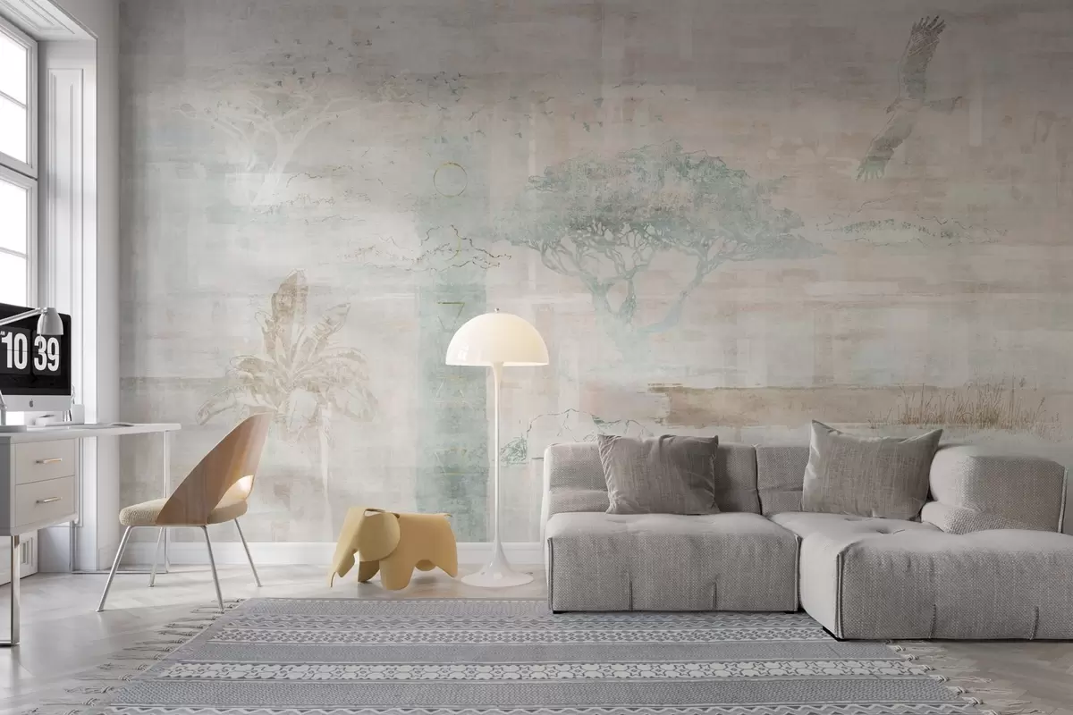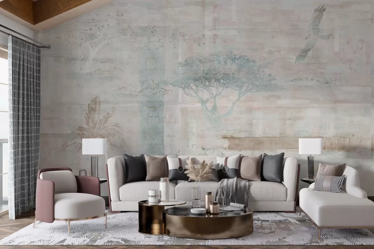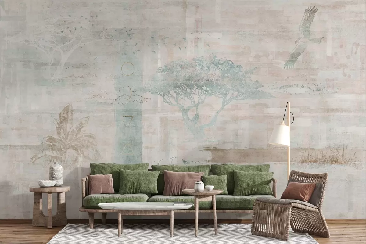 Papier peint Design vintage à effet grunge avec des arbres, un aigle et des éléments géométriques N° w02130