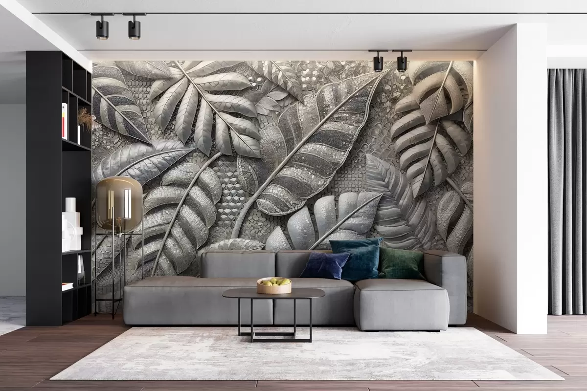 Papier peint Grandes feuilles tropicales dans des tons argentés délicats, dans un style mosaïque texturé N° w02135