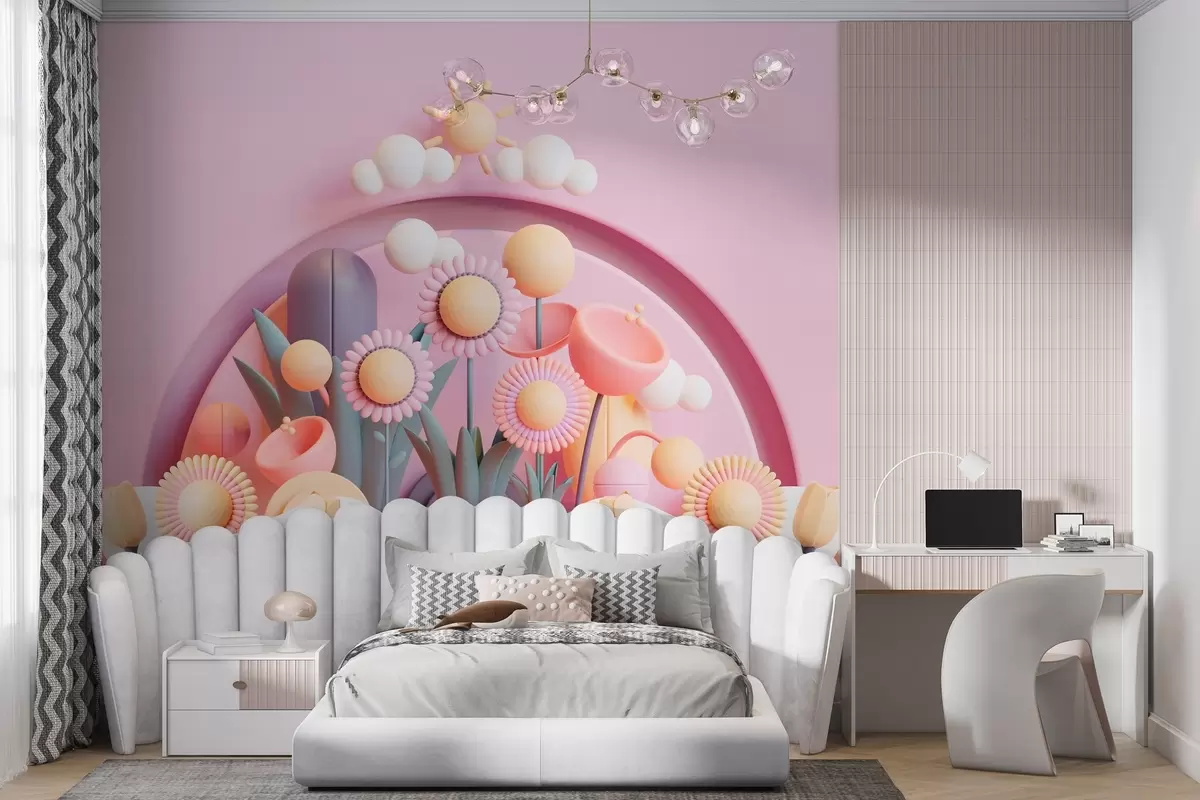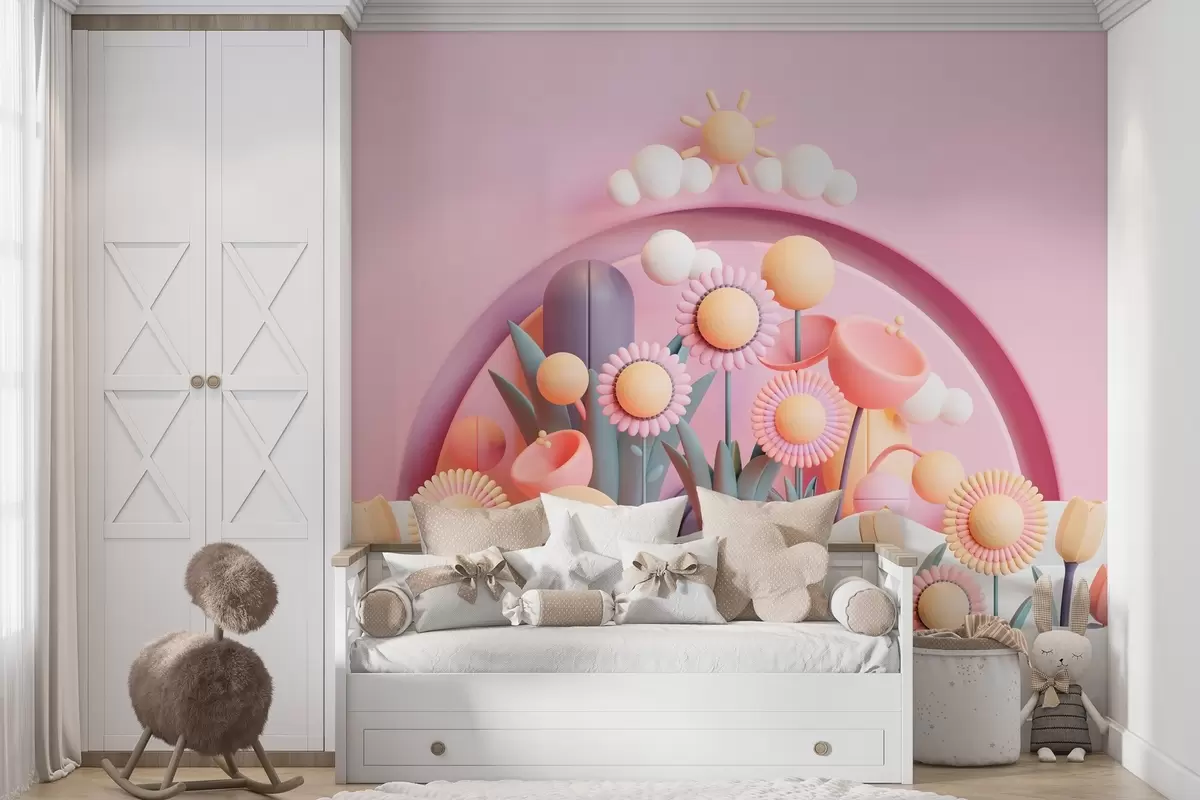 Papier peint Papier peint pour enfants en style 3D avec des fleurs et des nuages dans des tons roses N° w02136