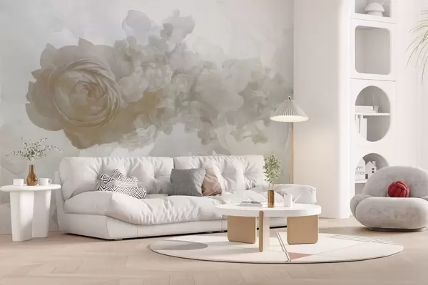 Papier peint Rose dans la fumée. Le papier peint s'inspire des motifs aériens de doom et de rose. Dans des tons beiges. N° w02138v1