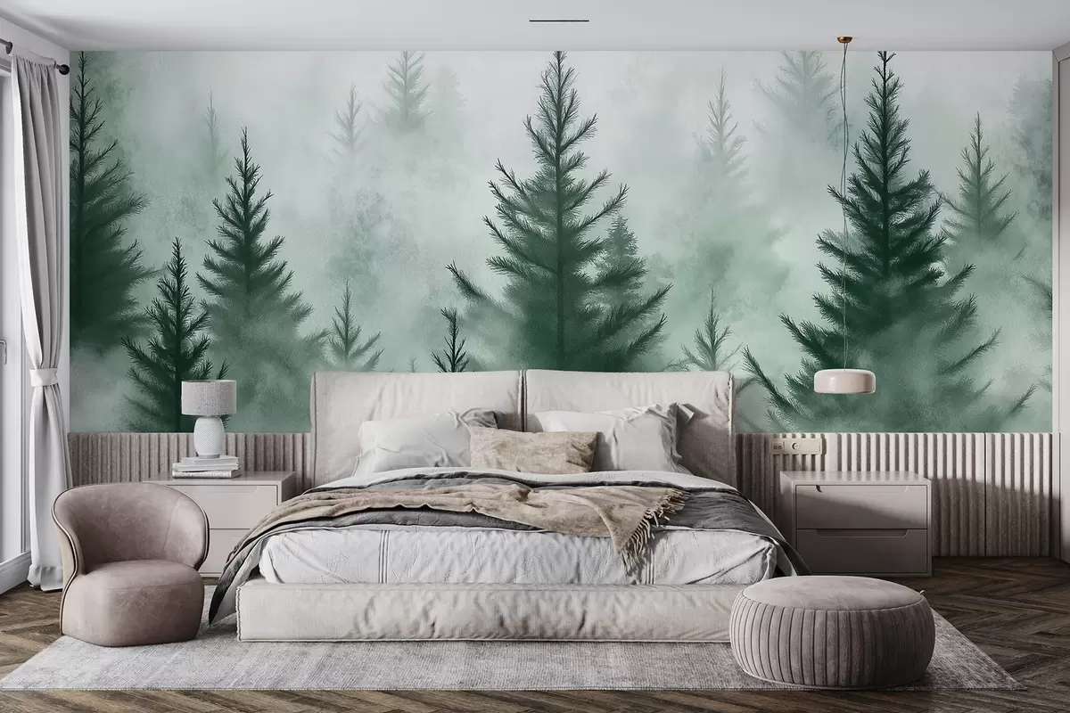 Papier peint Forêt dans la brume, pins, aquarelle, couleurs vertes N° w02152v1