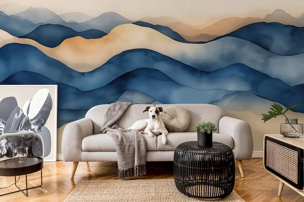 Papier peint Vagues abstraites bleu-beige rappelant des montagnes N° w02196