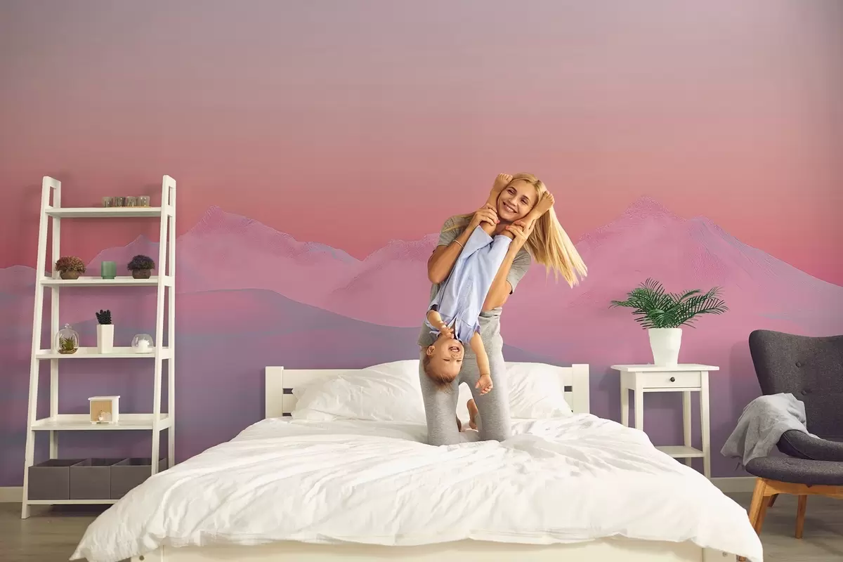 Papier peint Coucher de soleil doux et framboisé sur fond de montagnes et de ciel N° w02234