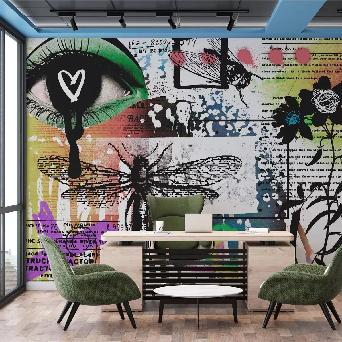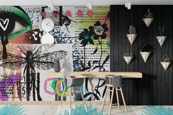Papier peint Inscriptions de style graffiti, fleurs, figures N° w02255