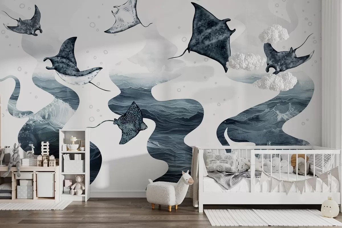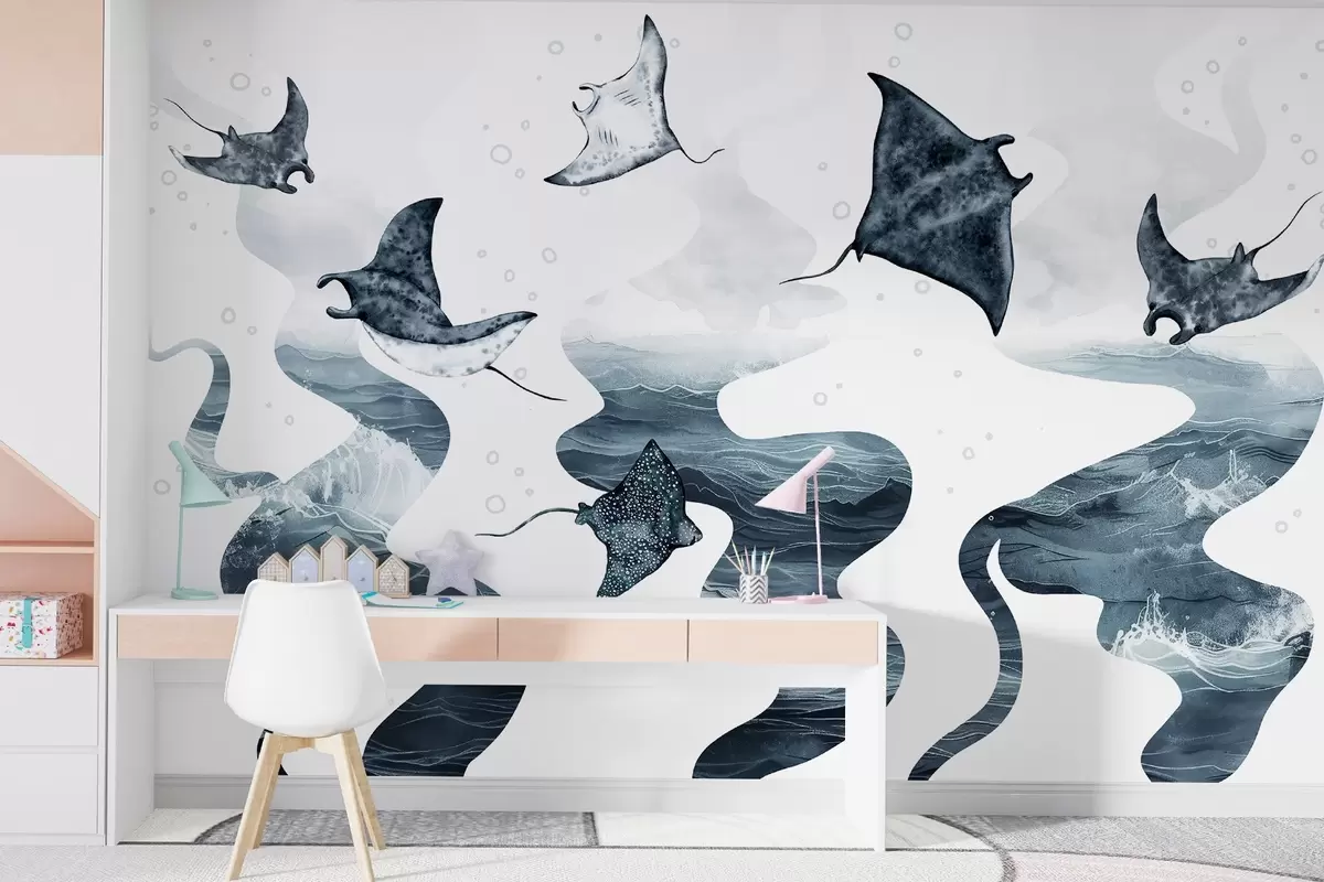 Papier peint Raie manta, aquarelle, mer, océan, couleurs grises N° w02266v1