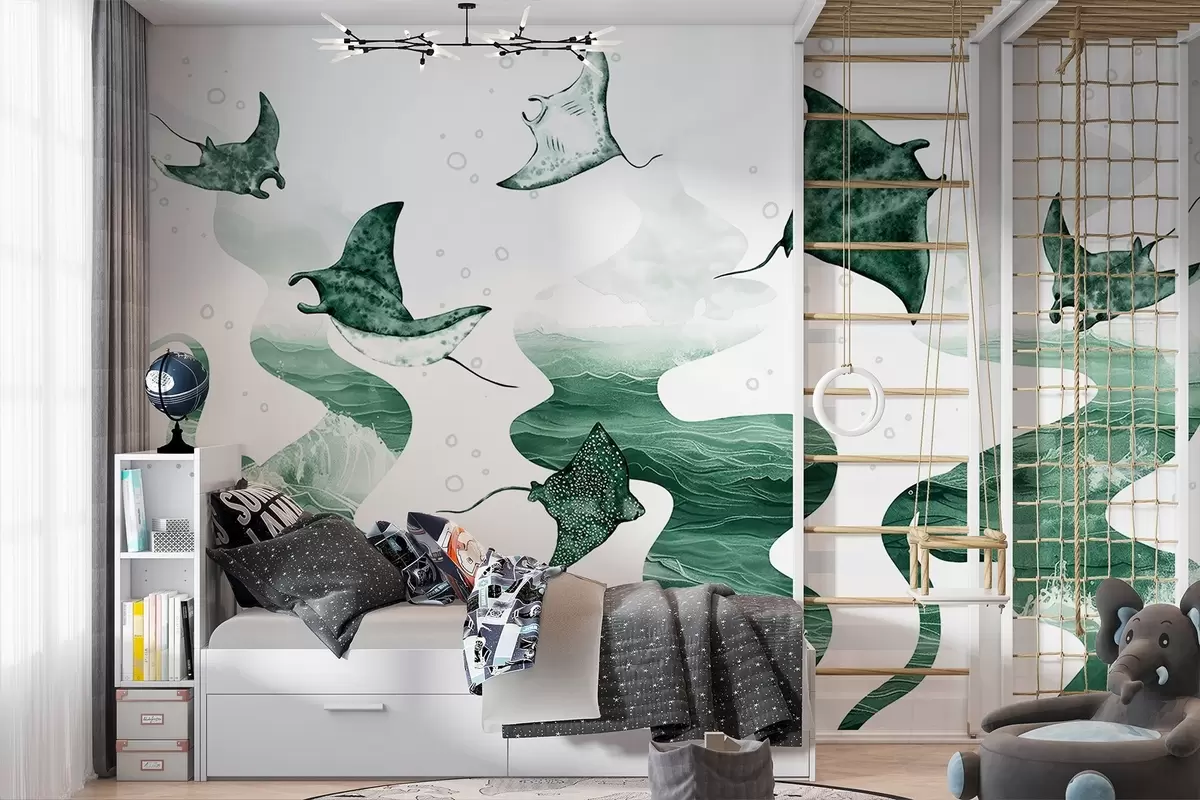 Papier peint Raie manta, aquarelle, mer, océan, couleurs vertes N° w02266v2