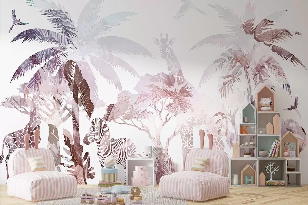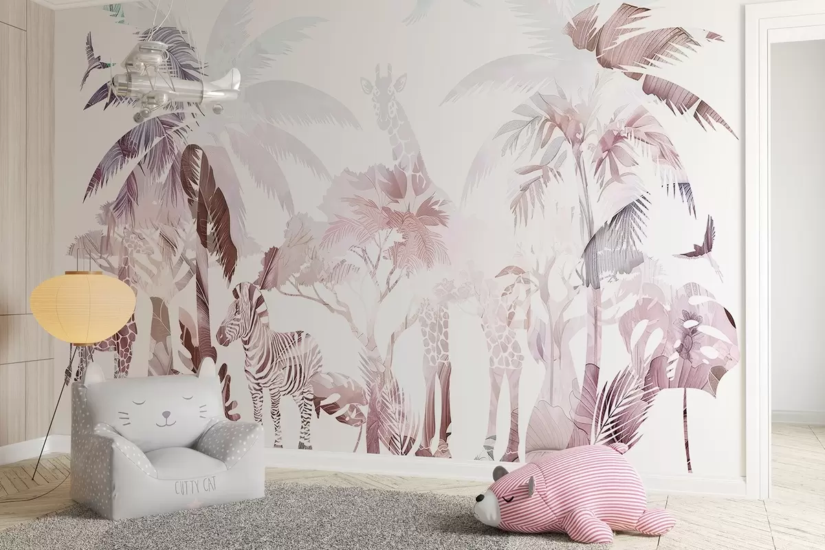 Papier peint Animaux de safari, palmiers, jungle, zèbre, girafe, couleurs roses douces N° w02267v1
