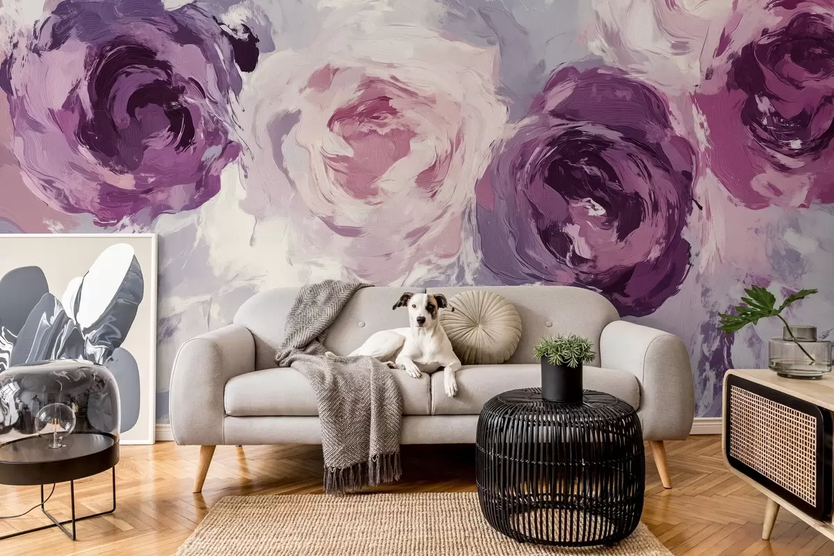 Papier peint Le papier peint est une imitation de peinture à l'huile, représentant de grandes fleurs de roses floues dans des tons pastel. N° w02288