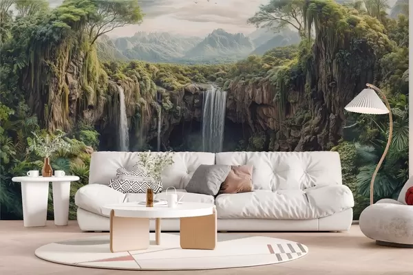 Papier peint grand panorama du canyon avec des arbres et une chute d'eau N° w02294