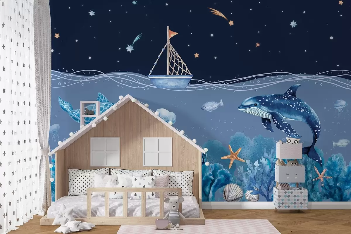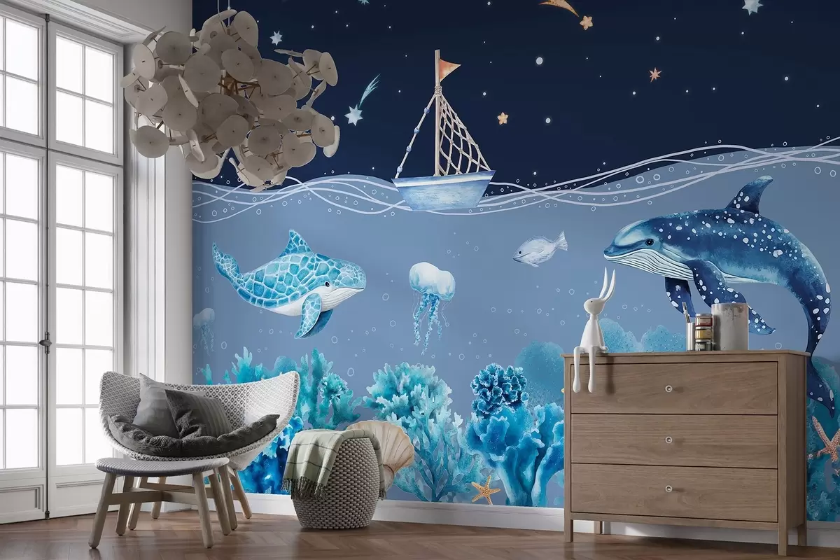Papier peint Vie marine, style aquarelle, coraux, bateau, dauphin, méduse, ciel étoilé, couleurs bleues N° w02310