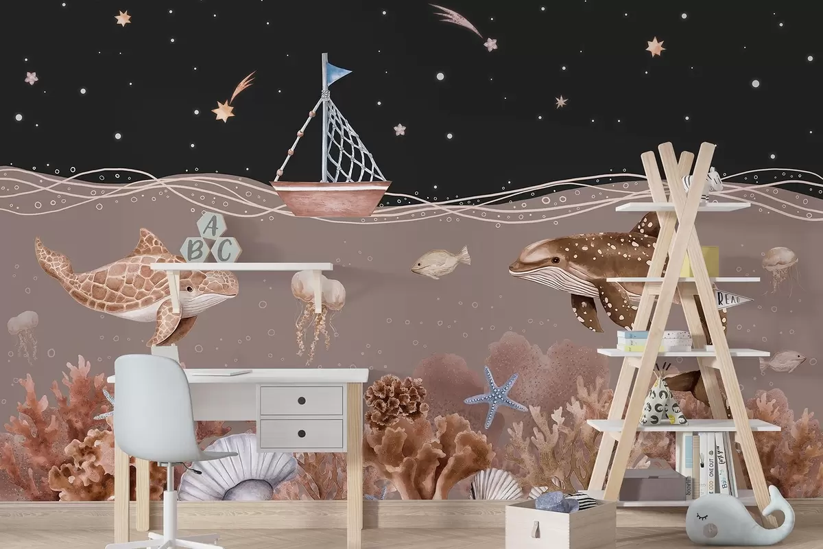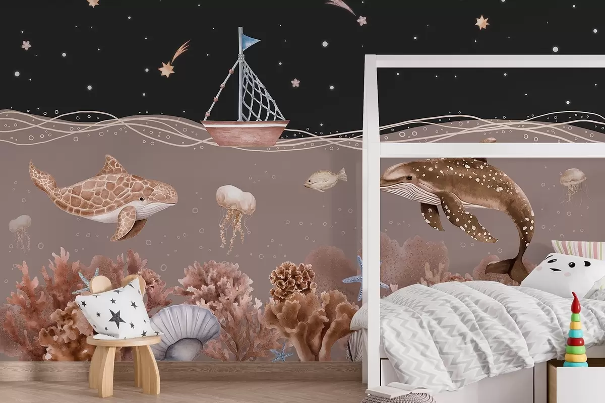 Papier peint Vie marine, style aquarelle, coraux, bateau, dauphin, méduse, ciel étoilé, couleurs beiges N° w02310v1