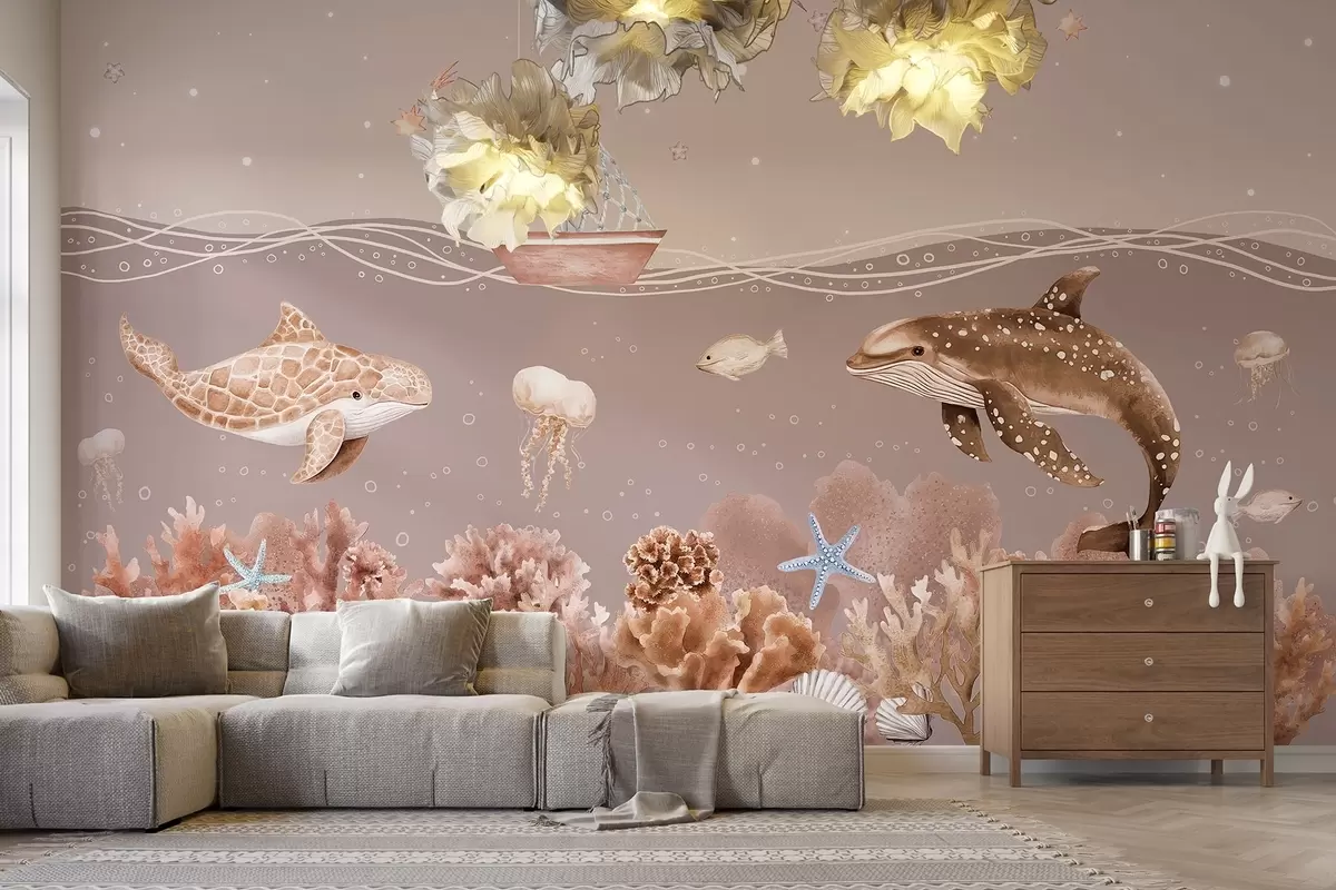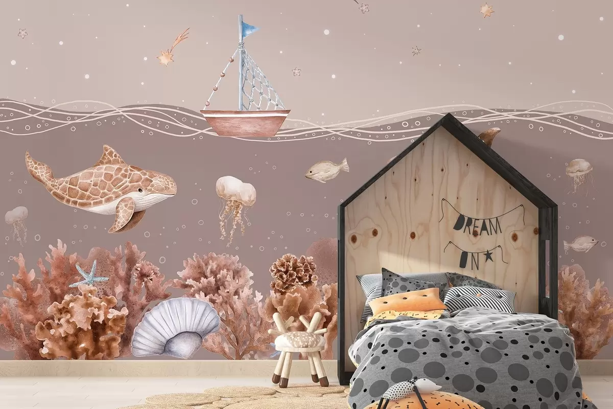 Papier peint Vie marine, style aquarelle, coraux, bateau, dauphin, méduse, ciel étoilé, couleurs beiges N° w02310v4