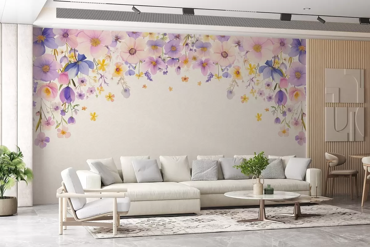 Papier peint Arrangement floral délicat avec des fleurs aquarelles dans des tons pastel doux de rose, violet et jaune. Les fleurs tombent en cascade depuis le haut, laissant un léger fond à motifs en dessous. N° w02345