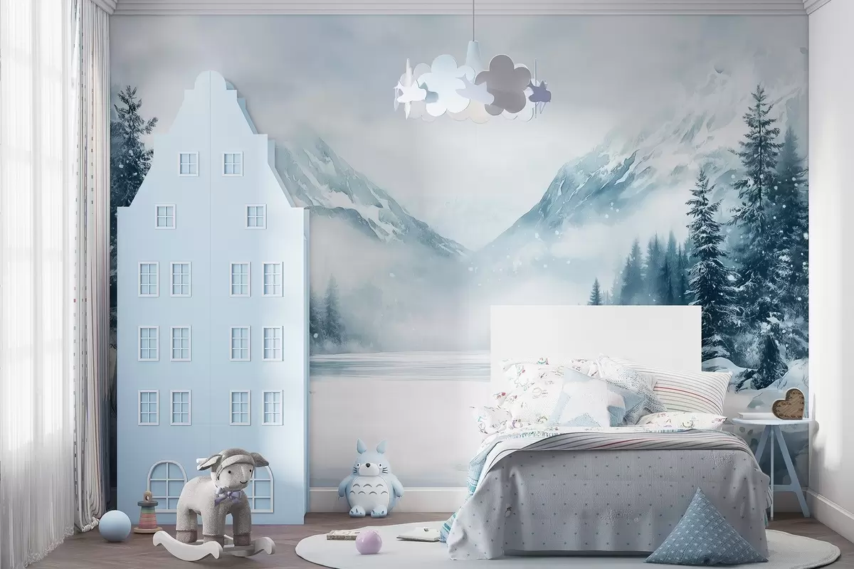 Papier peint Montagnes alpines dans la neige, style aquarelle, hiver, couleurs bleues, pins N° w02356