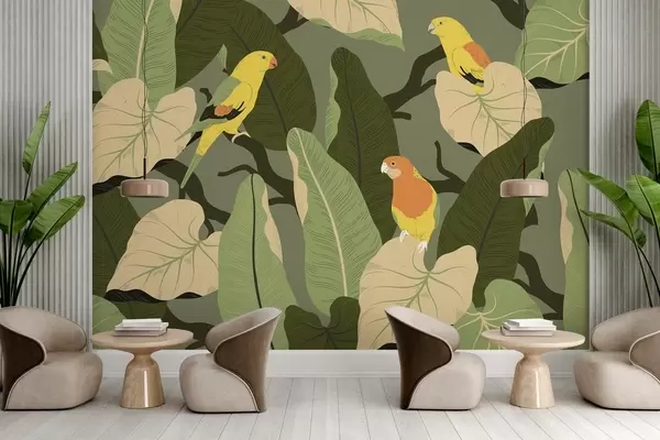 Papier peint feuilles tropicales avec perroquets N° w02402
