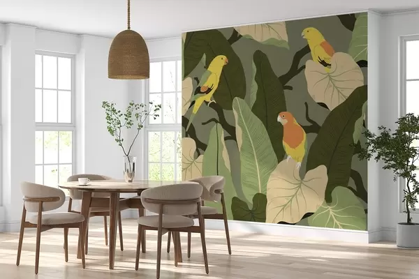 Papier peint feuilles tropicales avec perroquets N° w02402