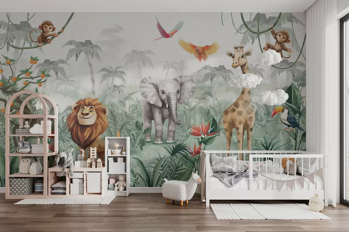 Papier peint Motif de jungle pour enfants avec lion, girafe, éléphant et perroquets N° w02440