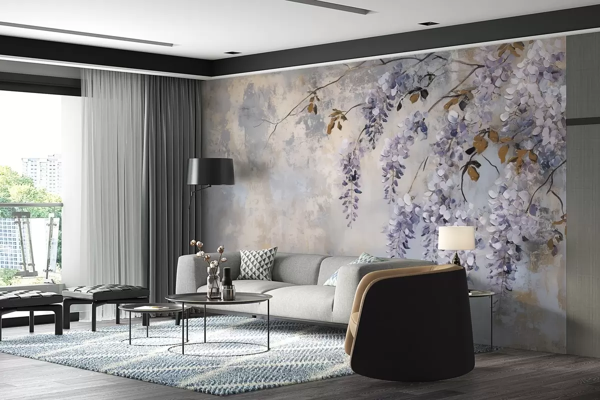 Papier peint papier peint texturé aux couleurs douces et sourdes avec des fleurs et des branches de glycine délicates. N° w02451