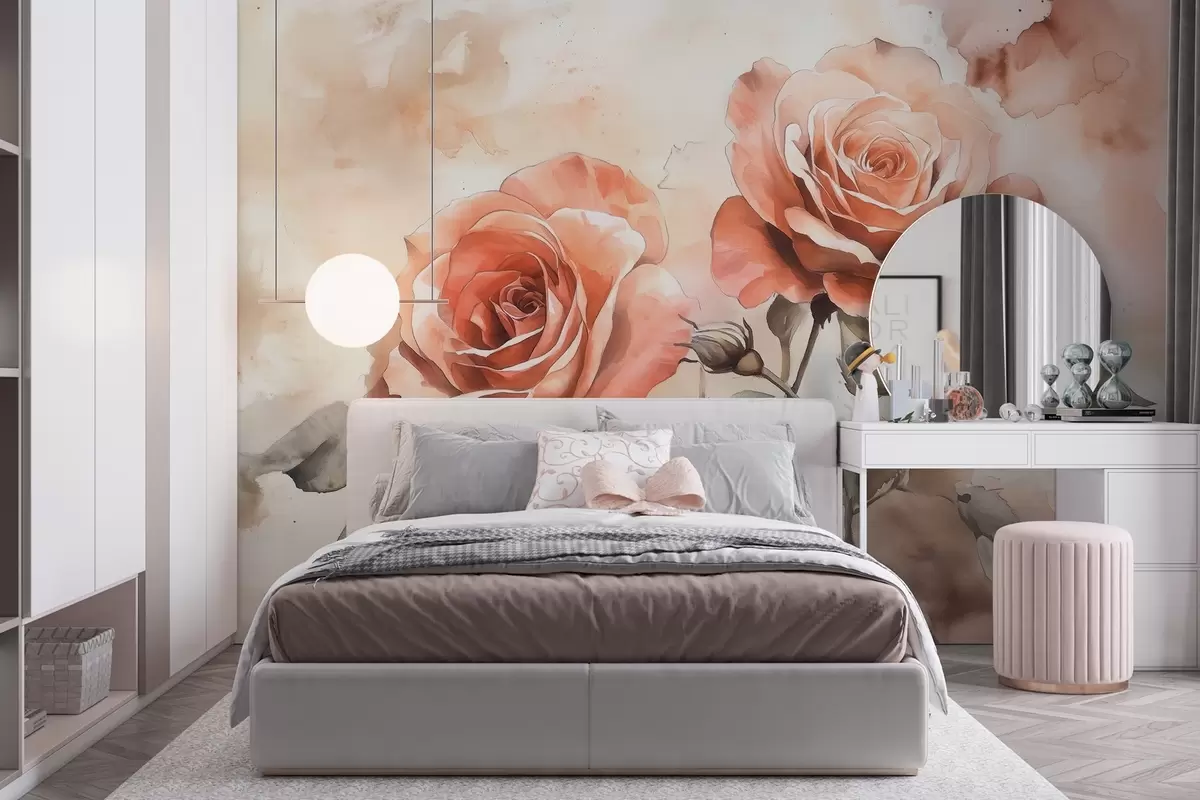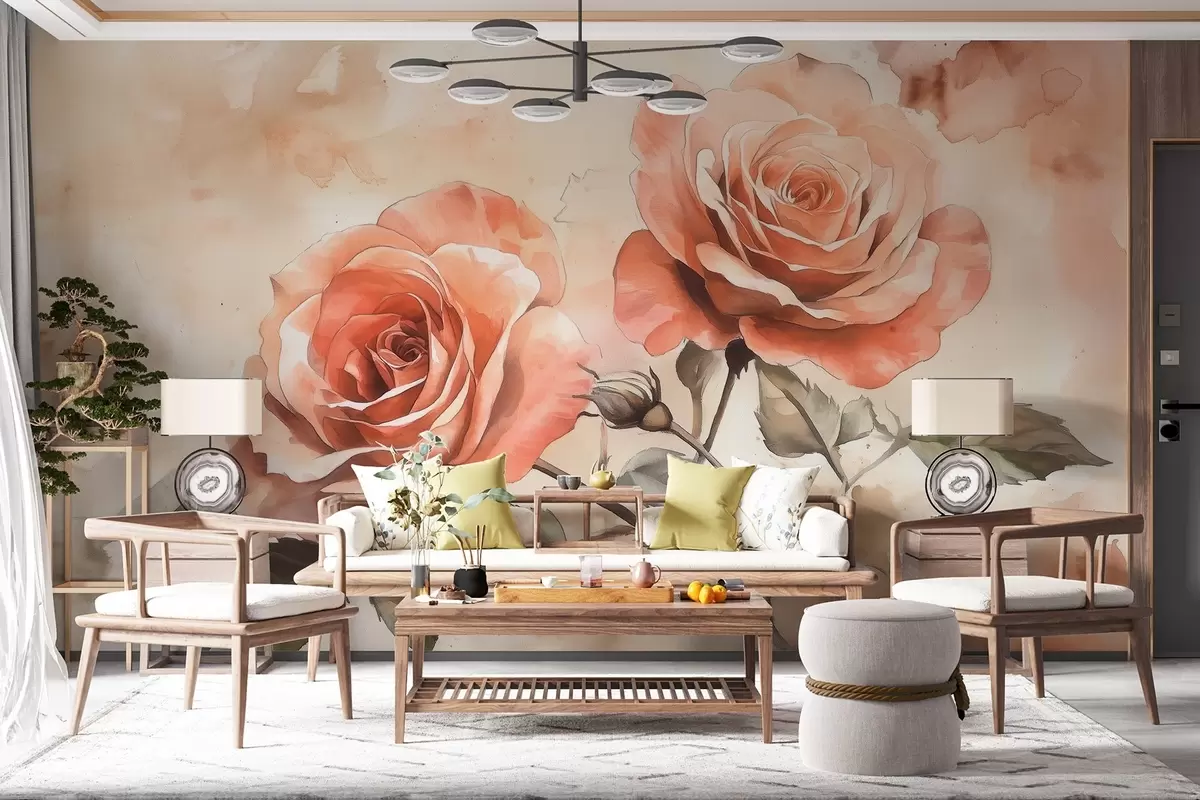 Papier peint Belles roses rouges en style aquarelle, floral, couleurs beiges N° w02486