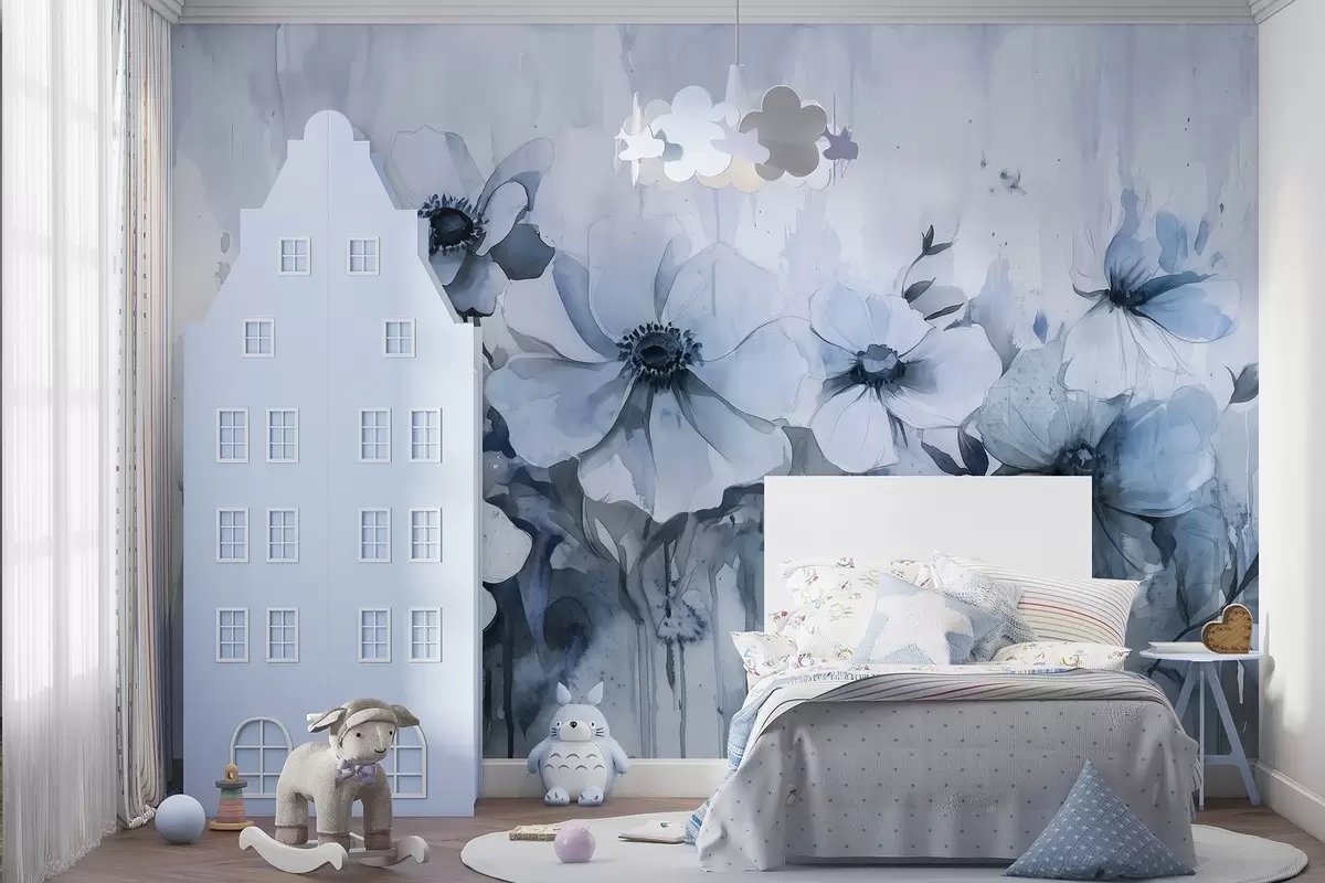 Papier peint Fleurs rustiques, dessin de style aquarelle, couleurs bleues N° w02487v1