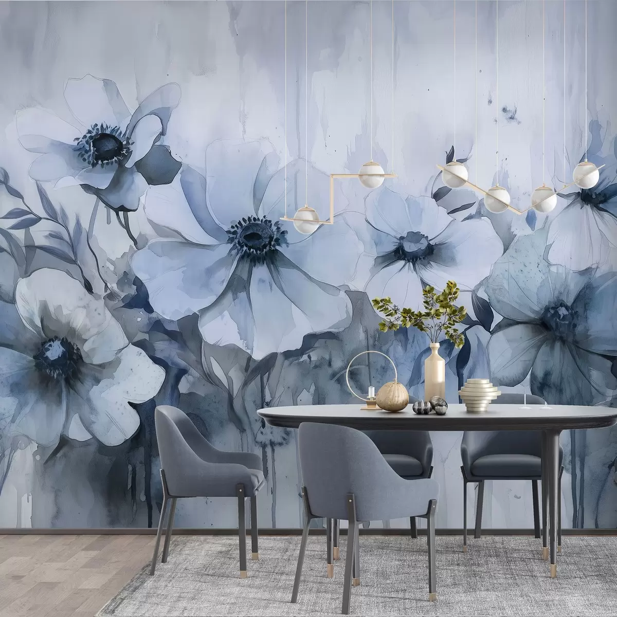 Papier peint Fleurs rustiques, dessin de style aquarelle, couleurs bleues N° w02487v1