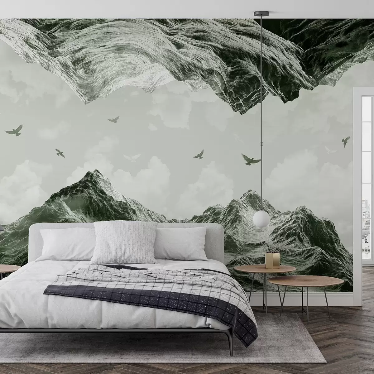 Papier peint Montagnes, paysage, réalisme, oiseaux volants, nature, nuages, couleurs vertes N° w02514v3
