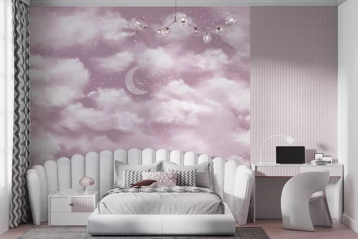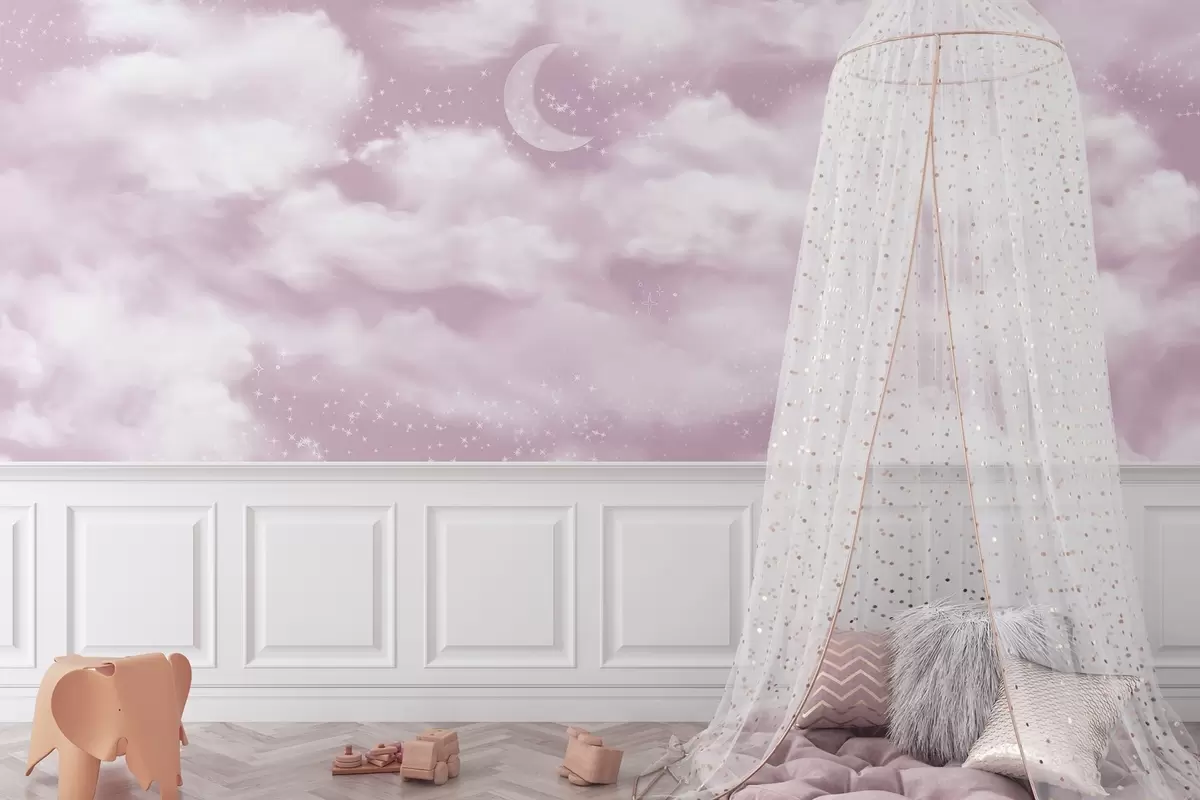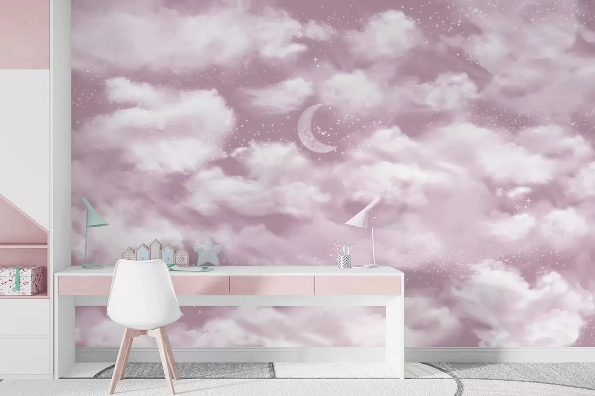 Papier peint Ciel étoilé avec lune et nuages, rêve, éthéré, couleurs roses douces N° w02515v3