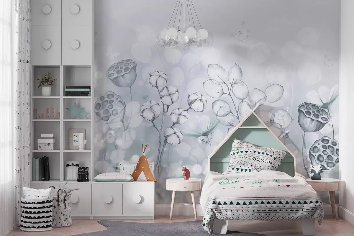 Papier peint Jardin de fleurs de rêve, papillon, fleurs de coton, lotus, couleurs grises N° w02516v2