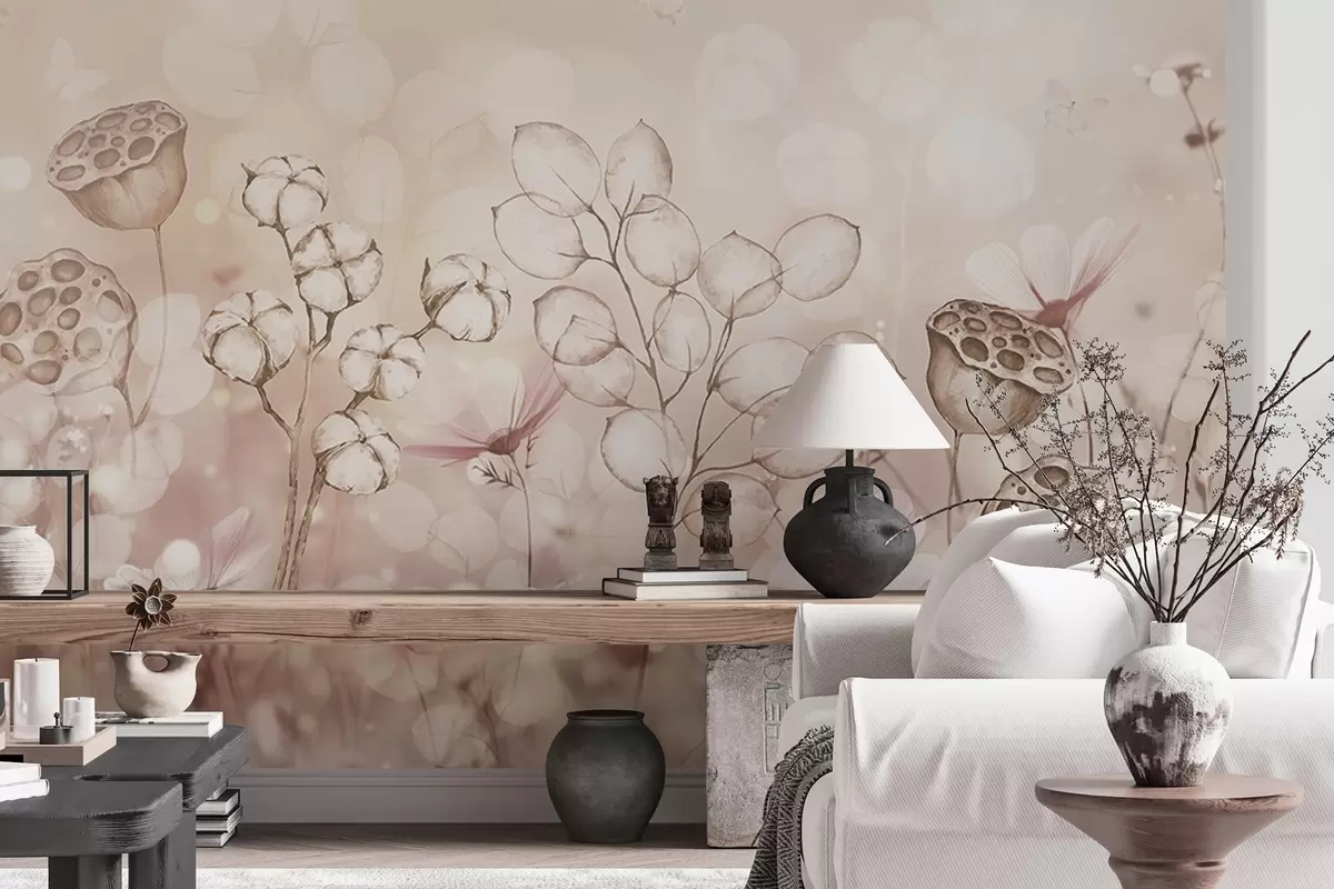 Papier peint Jardin de fleurs de rêve, papillon, fleurs de coton, lotus, couleurs beiges N° w02516v3