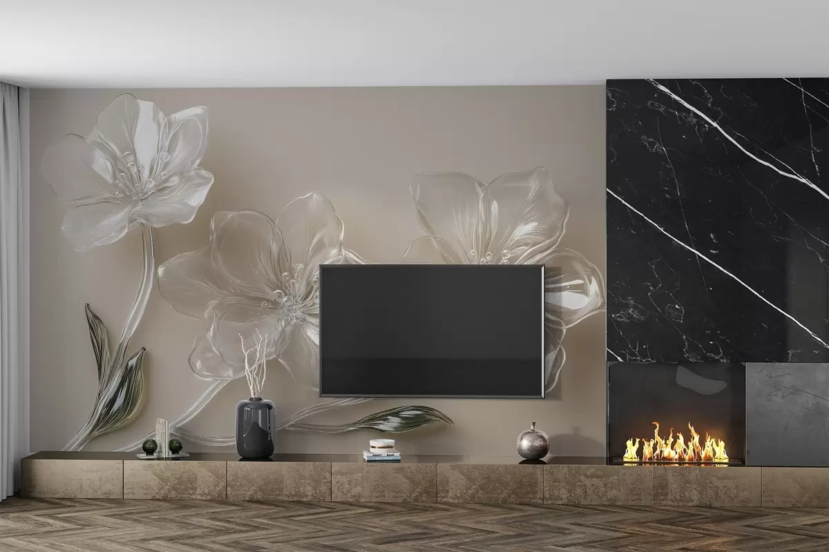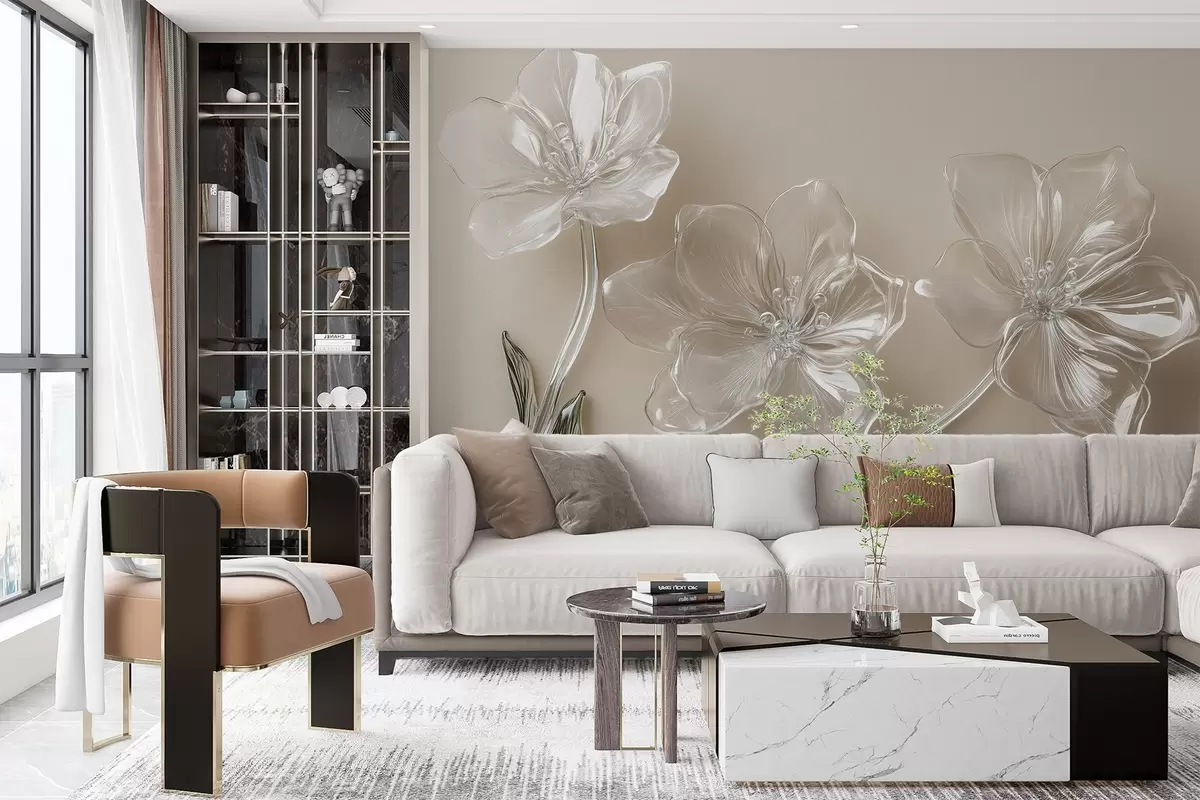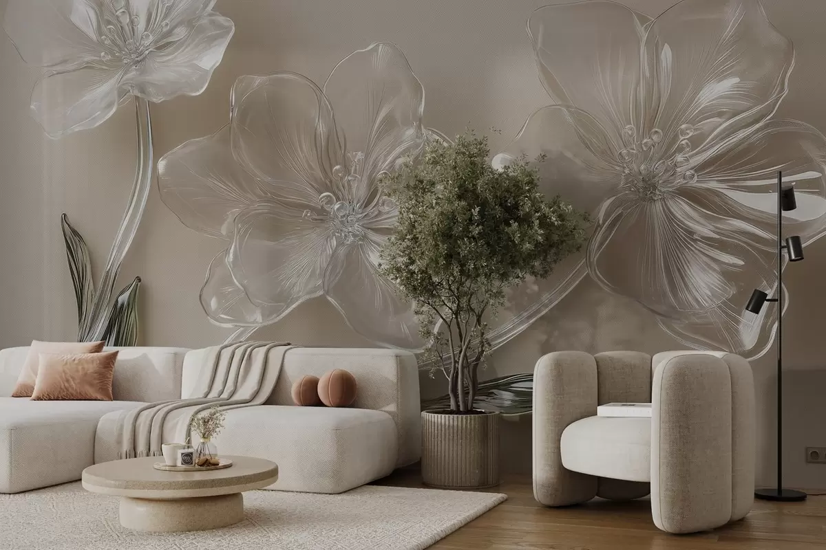 Papier peint grandes fleurs imitation verre sur fond beige N° w02518